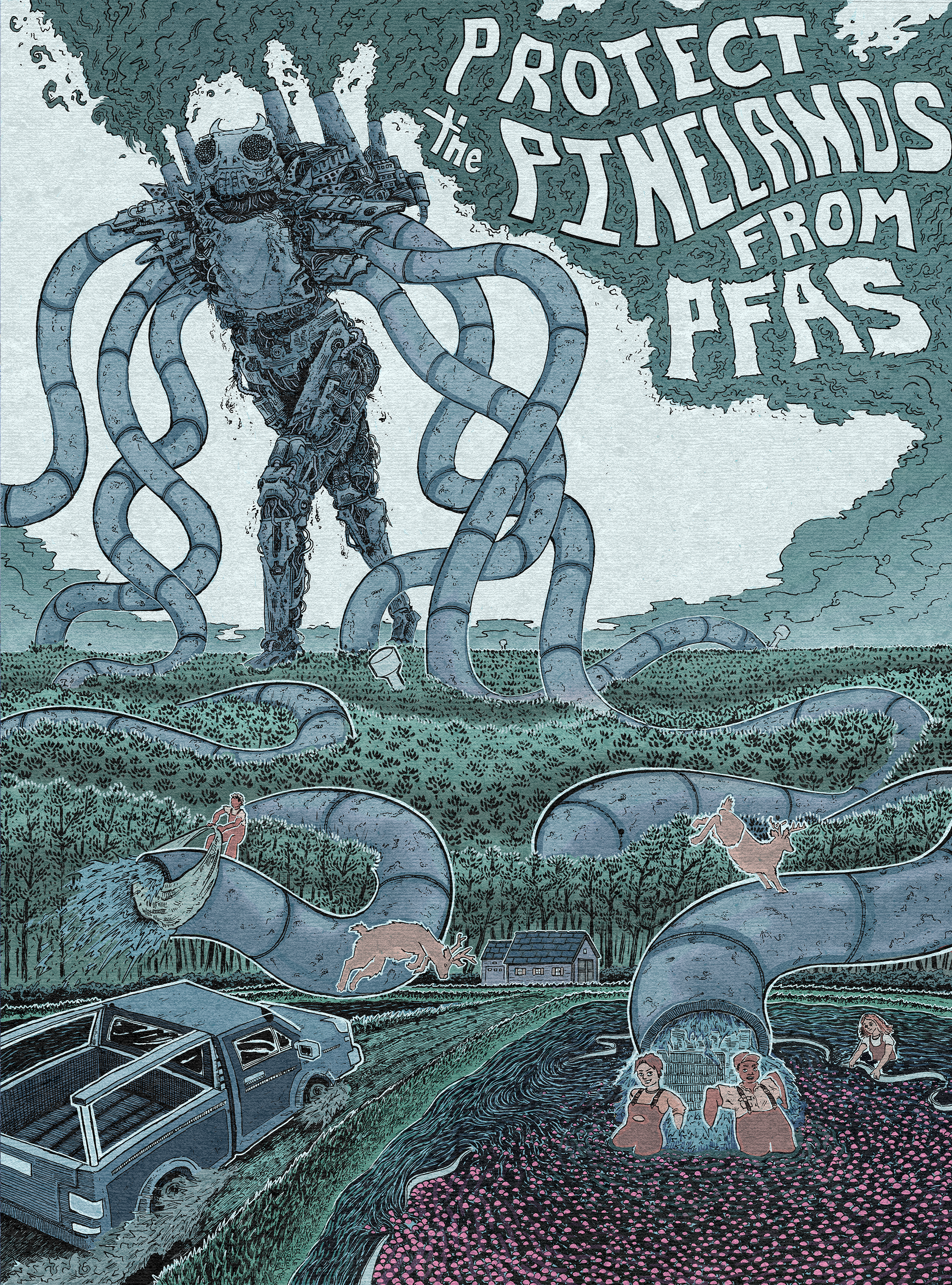 THIS POSTER IS PART OF MY ENVIRONMENTAL POSTER SERIES, PRESERVING NATURE THROUGH COMMUNITY. This poster uses a symbolic mechanical pollution monster to REFLECT ON THE PROBLEM OF FOREVER CHEMICALS LEACHING THROUGHOUT THE NEW JERSEY PINELANDS.